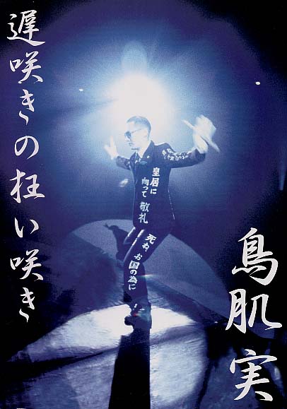 ここは散らかし放題です。お掃除嫌いなんです。 (私の勝手な解釈から徐々に愉快な資料へと変化しております) モティーフ 一般庶民から距離を置かれている対象全て。 禁じ手を敢えて使う理由 犬が腹を出して寝るのとは違うな。 人が見たいと思うものを見せている。 ルックス 笑いにハンサムはマイナス。 プラスに転化させるにはどうしたらよいか。 きっかけを掴むには有効だが、芸自体の評価が歪んでしまう。 アイドル的称賛に用はない。 いかにギャップを作るか。頭の使いどころ。 ネタ 「アレはホントか?ネタか?」。 この疑問は「あの歌詞は実体験?創作?」と変わらない。 いずれも人を楽しませられるなら採用するだろう。 映画『けものがれ、俺らの猿と』感想 内容はうだつのあがらない主人公が 様々な災難に遭うというもの。 映像は寺山修司をイメージさせるシーンあり。 なんというか、男受けする感じ。 体育館とかで上映したら合いそう。つまり汗臭い。 鳥肌氏演じる‘田島’が一番マトモ。しかも力演。 哀しそうに暴れる甘える。 観客 いきなりの街頭演説から 代々木競技場を埋めるほどに増員させたのである。 単なる野次馬、美形好きの人達も含め、 関心を集めるには充分過ぎる芸風に、 何を、どこを、刺激されたか、問われる。 トラヴィダ語 CD『鳥肌実』収録。 さて、この言語は実在するのか?調査した。 この語自体は存在しないようだが、ドラヴィダ族は存在する。 ‘前2000年紀のアーリア人南下以前に インドの主たる住民であったとされる種族。 現在南インド・セイロン北部(スリランカ)に多く居住’ (広辞苑より) *「モヘンジョ・ダロ」「ハッラー」に代表される インダス文明の担い手は、イラン高原から移住した ドラヴィダ人という説が有力。 *古代インドの神話に登場する、 鼻のない、奇妙な言葉使い(笑)の悪魔は、 先住民族ドラヴィダ人であるといわれている。 *ダイヤの原石を最初に発見したともいわれる。 (以上*、文鳥鈴女様より) 他、南インドで制作される映画(テルグ語映画)には 赤旗を振り踊る、 コミュニズム・ミュージカルという分野がある。 他の芸人さんのネタにされる 2002年6月『笑いの神様2』にて、 自衛隊員・山一二三氏(現在は大和衛と改名)が披露。 (鳥肌氏とテイストが近い芸人さんのようです) 「1,2,1,2」と走って入場。 敬礼&気をつけで、自己紹介ネタ。 「今朝、親離れに失敗いたしました」 「ワタクシ、レゴブロックで出来ております」 「絶滅しました…黙祷…」(朱鷺保護センターネタ) 自衛隊からの支給品のビキニパンツが豹柄。「あゆみたい」。 乾パン、酢昆布、ビスコが夜食。 ビスコの数え方は「1スコ、2スコ…」。 「4スコ食べたので、1ヶ月ビスコ抜きの処分」 「ブラジャーしながら腕立て伏せをしていた。 そのせいでラジャーを『ブラジャー』と言ってしまった。 いじめにあうかと思ったら無く、 自分の胸にもブラがあった」(細山田さんネタ) 以下、鳥肌邸訪問&会食ネタ。 ネタを見せたら「面白いっ!」と、 自分のCDや写真集等を差し出し「5000円です」。 鳥肌氏行きつけの高級うどん店へ。「ワリカンです」。 鳥肌氏は1200円の讃岐うどん、 山氏は800円のタヌキうどんを注文、 山氏は1000円支払った。 (情報提供:赤紫式部様) 2003年1月23日、 同じく山一二三氏の『自衛隊民営化・記念式典』にて、 中将(=鳥肌氏)に触れた場面を抜粋。 この日は山氏の誕生日(という設定)、 数々の祝辞を読み上げる段。 内、衆議院議員・川内博史氏は直接お祝いに訪れた。 「自衛隊民営化となると、鳥肌さんは取締役になるのかね? 大将・中将・少将などの階級はどうなるんだ? 社長とか言うのかね?」と質問。 しかし山氏は答えられず、 川内氏はすかさず「考えてきてないようだね」。 ウケ狙いか、舞台去り際に国旗に一礼した川内氏は 中将と友人関係らしい。 (情報提供:赤紫式部様) ジム・モリスン(ドアーズ) 鳥肌氏が公言しているお気に入りアーティストのひとり。 同じポーズのポスター↓ 以下はBBS『談話室ことり』にいただいた書き込みを借用。 提供は文鳥鈴女様。 『動物の唄』、この元ネタはThe Doorsの『The End』 1st.アルバム邦題『ハートに火をつけて』のラストに収録 12分弱の大作、名曲だと思っとります。 F・コッポラ監督の『地獄の黙示録』でも 印象的に使われてました。 曲の後半、エディプス・コンプレックスを材にとった 「父さん、アンタを殺したい。母さん、アンタを…(F××K)」 なんてぇ台詞も吐かします。 ここらへんは『僕の夢』にも繋がる?(繋げたがり) O・ストーンが監督した映画『the doors』 主演のV・キルマーのなりきりっぷりは笑えますが、 ジム・モリスンがどんな男だったかということは伺い知れます。 「これはさすがに脚色だろ」と思っていた奇行、 愛人と魔女儀式、レコーディング中にフ○ラ等々…実話です。 ライヴシーンもなかなかイイ出来。 ちなみに『フォレスト・ガンプ』でガンプの高速卓球シーン、 同アルバム1曲目 『Break 